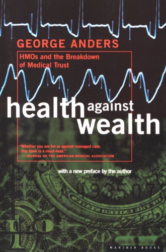 The HMO system is often praised for cutting runaway costs. It is supposed to act as a powerful market force to stop greedy doctors and hospitals from treating patients like pi-atas, to be cut open for profit. Health Against Wealth reveals that when you are confronting cancer, heart disease, or psychiatric illness, when you face a medical emergency or your child requires complex pediatric surgery, all those cost-saving rules and artful ways of keeping doctors frugal can turn against you. Wall Street Journal reporter George Anders explains why " managed care " is so appealing to employers and insurers and how HMO bureaucrats can thwart necessary, even life-saving treatment under the guise of cost efficiency. Health Against Wealth takes an unf